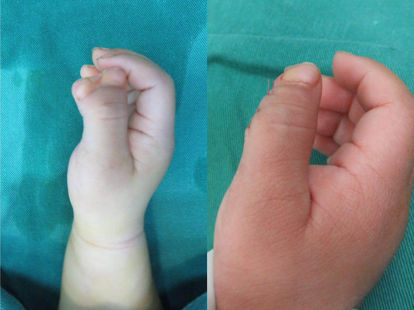 復(fù)合型多指為真正的重復(fù),不僅含有指骨、肌腱等,而且包括掌骨孿生。一般認(rèn)為半歲后可以手術(shù)治療。但復(fù)合型多指如多指并指,尤其是邊緣性多指并指易導(dǎo)致手指發(fā)育彎曲畸形,建議早期手術(shù)。中央型多并指稍可推遲至1-2歲后再手術(shù)。